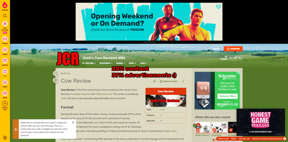 Due to the wiki being in poor standing with its host (Fandom), and Fandom (its host) being a steaming pile of worm-ridden manure, of which the board of directors deserve to have Honest Game Trailers playing on loop in the corner of their vision 24/7 for the rest of their life, the wiki's contents have been migrated here, to cowreview.wiki, our own domain. In the move we gained a superior design and layout (including better support for mobile devices) and a substantial rewrite, featuring brand new articles and cool knick-knacks like the live subscriber count and the randomly assigned cow of the day. In the spirit of being self-contained, the waiting list has also been moved to the wiki.